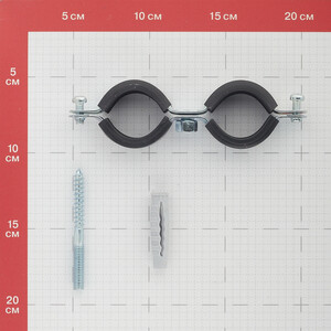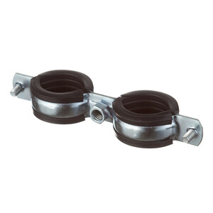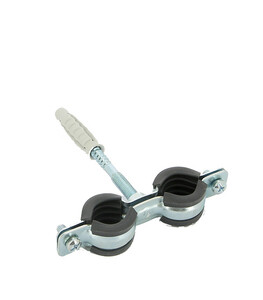 Предназначен для крепления полипропиленовых, полиэтиленовых или иных труб диаметром 32-36 мм к стене или к полу. Два одновинтовых хомута на двойной скобе для параллельного монтажа двух труб, шуруп-винт и дюбель в комплекте, дополнительные элементы не нужны. Звукоизоляционный вкладыш из EPDM-резины, черный, вкладыш устойчив к старению. Межосевое расстояние - 85 мм. Производитель рекомендует использовать дюбель диаметром 10 мм.